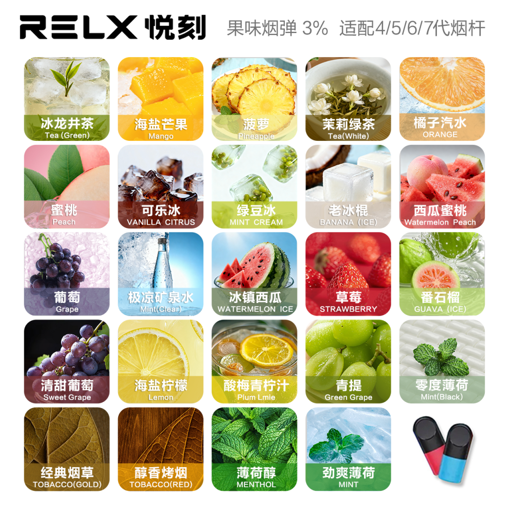 橘子汽水, 可乐冰, 绿豆冰, 老冰棍, 西瓜蜜桃, 葡萄, 极凉矿泉水, 冰镇西瓜, 极冰西瓜, 极冰红牛, 清甜葡萄, 海盐柠檬, 酸梅青柠汁, 青提, 蜜桃, 冰龙井茶, 菠萝, 茉莉绿茶, 草莓, 番石榴, 薄荷醇, 劲爽薄荷, 零度薄荷, 经典烟草, 醇香烤烟